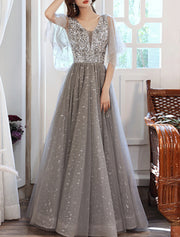 A-Line Evening Gown Sparkle Dress Wedding Guest Formal Evening Floor Length Half Sleeve V Neck Tulle with Sequin Splicing