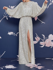 A-Line Evening Gown Sparkle Dress Wedding Guest Party Wear Floor Length Long Sleeve V Neck Sequined with Sequin Slit - US 2 / UK 6 / EU 32