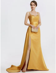 A-Line Evening Gown Sparkle Dress Wedding Prom Sweep / Brush Train Sleeveless Spaghetti Strap Satin with Rhinestone Ruched