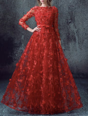 A-Line Glittering Elegant Floral Engagement Formal Evening Valentine's Day Dress Jewel Neck 3/4 Length Sleeve Floor Length Tulle with Sequin Appliques