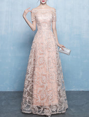 A-Line Minimalist Elegant Prom Formal Evening Dress Off Shoulder Short Sleeve Floor Length Tulle with Pleats