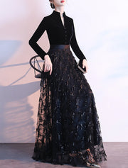 A-Line Party Dress Sparkle Elegant Prom Formal Evening Dress Queen Anne Long Sleeve Floor Length Sequined with Sash / Ribbon Sequin - US 2 / UK 6 / EU 32