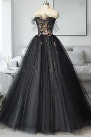 Black Tulle Long Prom Dress Black A-Line Strapless Evening Dress