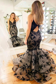 Black V-Neck Lace Long Prom Dress Mermaid Evening Party Dress