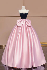 Black Velvet and Pink Satin Long Prom Dress with Bow Beautiful A-Line Strapless Formal Party Dress