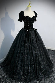 Black Velvet Tulle Long Ball Gown Black A-Line Formal Evening Gown