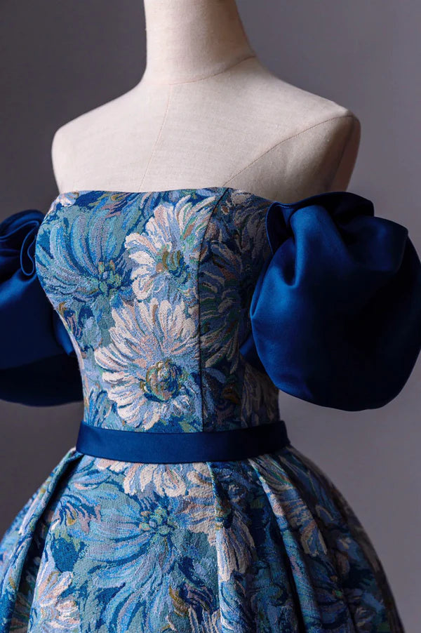 Blue Printed Long A-Line Prom Dress Blue Off the Shoulder Formal Evening Dress