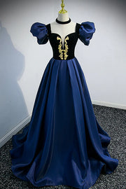 Blue Satin Lace Long Prom Dress Blue Short Sleeve Evening Party Dress