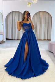 Blue Spaghetti Strap Chiffon Lace Long Prom Dress Beautiful A-Line Evening Party Dress