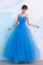 Blue Spaghetti Strap Tulle Long Prom Dress Cute Blue Evening Party Dress