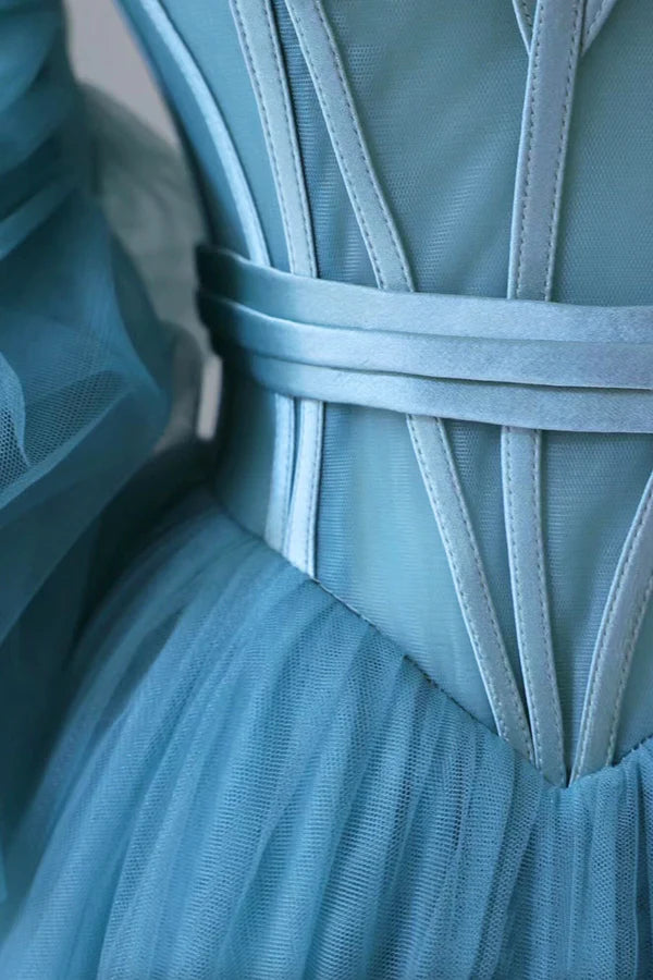 Blue Tulle Long Spaghetti Strap Prom Dress and Corset Detachable off Shoulder Party Dress