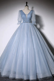 Blue V-Neck Tulle Long Prom Dress A-Line Formal Evening Dress