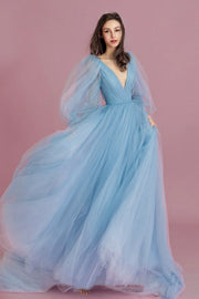 Blue V-Neck Tulle Long Prom Dress Beautiful Puff Sleeve Evening Dress – Buyishang Dresses index