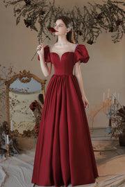 Burgundy Satin Long A-Line Prom Dress Cute Short Sleeve Graduation Dress