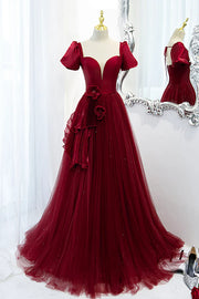 Burgundy Satin Tulle Long Prom Dress A-Line Short Sleeve Evening Party Dress