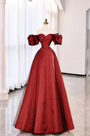 Burgundy Satin Tulle Long Prom Dress Off the Shoulder Evening Party Dress