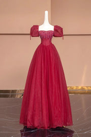 Burgundy Tulle Beaded Floor Length Prom Dress A-Line Short Sleeve Evening Dress