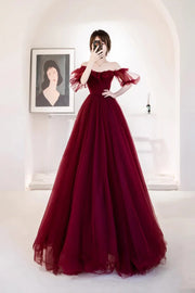 Burgundy Tulle Long Evening Dress Cute A-Line Off the Shoulder Graduation Dress - US 2 / UK 6 / EU 32