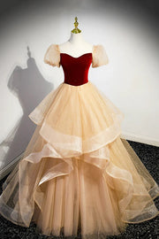 Burgundy Velvet Glitter Cascading Ruffles Prom Dress Champagne Tulle Floor Length Evening Dress - US 2 / UK 6 / EU 32