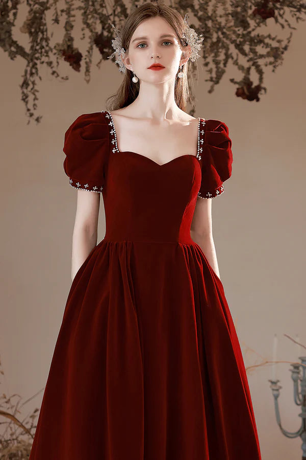 Burgundy Velvet Long Formal Dress A-Line Short Sleeve Evening Party Dress