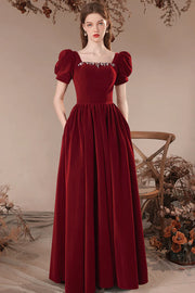 Burgundy Velvet Long Prom Dress Burgundy Short Sleeve Evening Dress