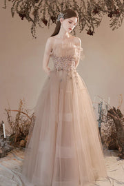 Champagne Strapless Tulle Long Prom Dress with Beaded A-Line Evening Party Dress