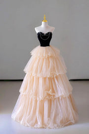 Champagne Sweetheart Tulle Layers Long Party Dress Strapless A-Line Prom Dress