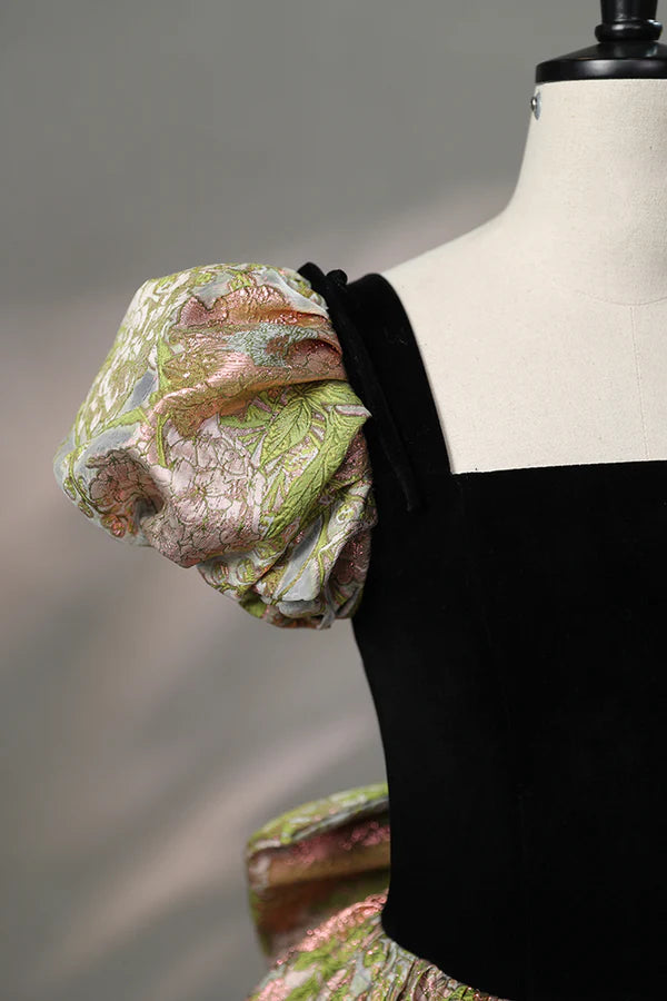 Elegant Black Puffy Short Sleeve Floor Length Prom Dress A-Line Floral Pattern Evening Dress