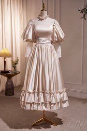 Elegant Champagne Satin A-Line Prom Dress Champagne Ruffle High Neck Puffy Short Sleeve Backless Evening Dress