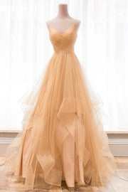 Gold V-Neck Tulle Long Prom Dress A-Line Evening Dress