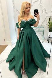 Green Satin Beaded Long Off the Shoulder Prom Dress A-Line Evening Dress with Slit