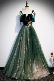 Green Tulle Long A-Line Prom Dress Green Spaghetti Straps Graduation Dress