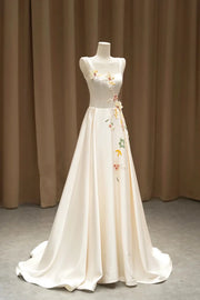 Light Champagne Satin Long Formal Dress with 3D Flowers Elegant A-Line Evening Party Dress