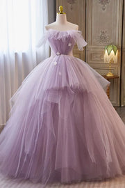 Lilac Strapless Tulle Long Prom Dresses with Pearls Belt Lilac Off the Shoulder Formal Evening Dresses
