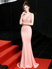 Mermaid / Trumpet Evening Gown Elegant Dress Formal Wedding Guest Sweep / Brush Train Sleeveless V Neck Cotton Blend with Beading Appliques - Pink / US 2 / UK 6 / EU 32