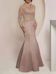 Mermaid / Trumpet Mother of the Bride Dress Wedding Guest Elegant Party Jewel Neck Floor Length Imitated Silk Long Sleeve with Lace Pleats