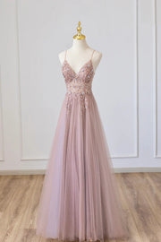 Pink Tulle Long A-Line Prom Dress Pink Spaghetti Formal Dress with Bea – Buyishang Dresses index