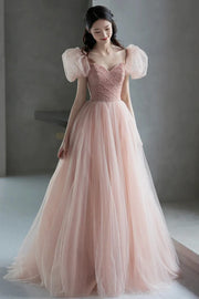 Pink Tulle Long A-Line Prom Dress with Beaded Lovely Puff Sleeve Evening Dress