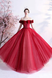 Red Tulle Off the Shoulder Long Prom Dress A-Line Graduation Dress