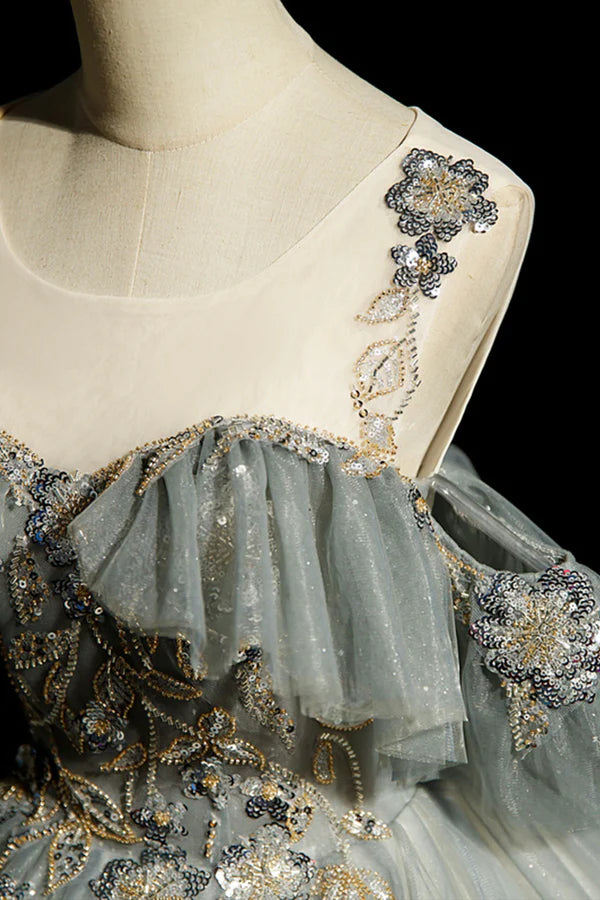 Scoop Neckline Tulle Long Formal Dress with Beaded A-Line Evening Dress