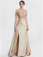 Sheath / Column Evening Gown Elegant Dress Formal Floor Length Short Sleeve Off Shoulder Sequined with Glitter Pleats Slit - Champagne / US 2 / UK 6 / EU 32