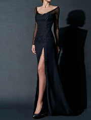 Sheath Party Dress Sexy Engagement Formal Evening Dress Scoop Neck Long Sleeve Floor Length Chiffon with Beading Lace Insert Split Front