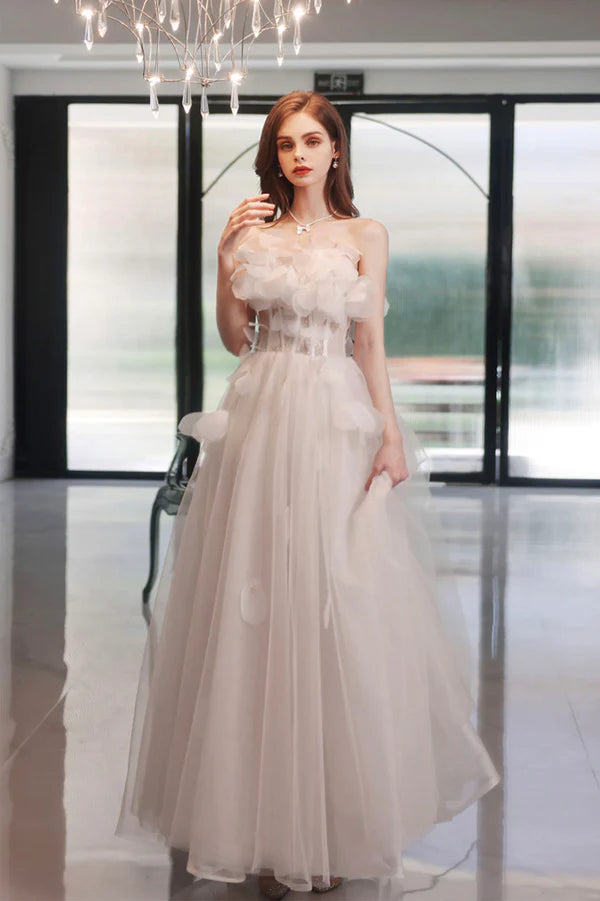 White Flowers Long A-Line Prom Dress Strapless Evening Party Dress