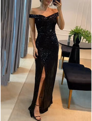 Women‘s Little Black Dress Prom Dress Party Dress Black Sequin Dress Maxi Dress Short Sleeve Spring Fall Winter Off Shoulder Party Evening Party Black Cocktail Dress