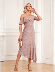Women's Sequin Dress Prom Dress Party Dress Midi Dress Khaki Sleeveless Plain Ruched Summer Spring Fall Cold Shoulder Elegant Evening Party
