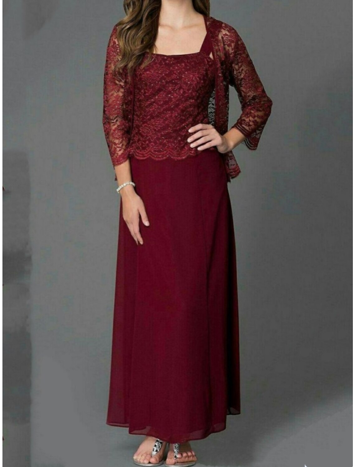 A Piece Mother of the Bride Dress Wedding Guest Party Vintage Elegant Square Neck Ankle Length Chiffon Lace 3/4 Length Sleeve with Pleats Sequin