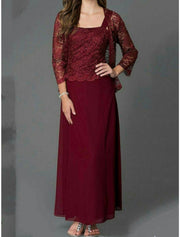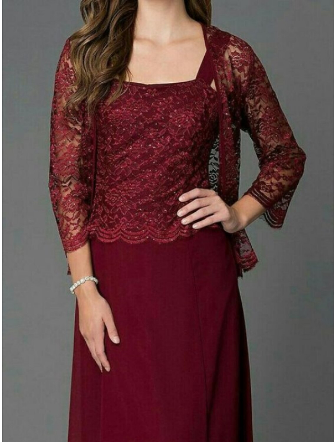 A Piece Mother of the Bride Dress Wedding Guest Party Vintage Elegant Square Neck Ankle Length Chiffon Lace 3/4 Length Sleeve with Pleats Sequin - US 2 / UK 6 / EU 32