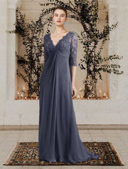 A-Line Mother of the Bride Dress Elegant V Neck Sweep / Brush Train Chiffon Lace Half Sleeve with Appliques