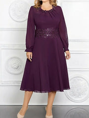 A-Line Mother of the Bride Dress Plus Size Jewel Neck Tea Length Chiffon Long Sleeve with Appliques