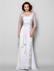 A-Line Mother of the Bride Dress V Neck Sweep / Brush Train Satin Chiffon 3/4 Length Sleeve with Criss Cross Beading Appliques